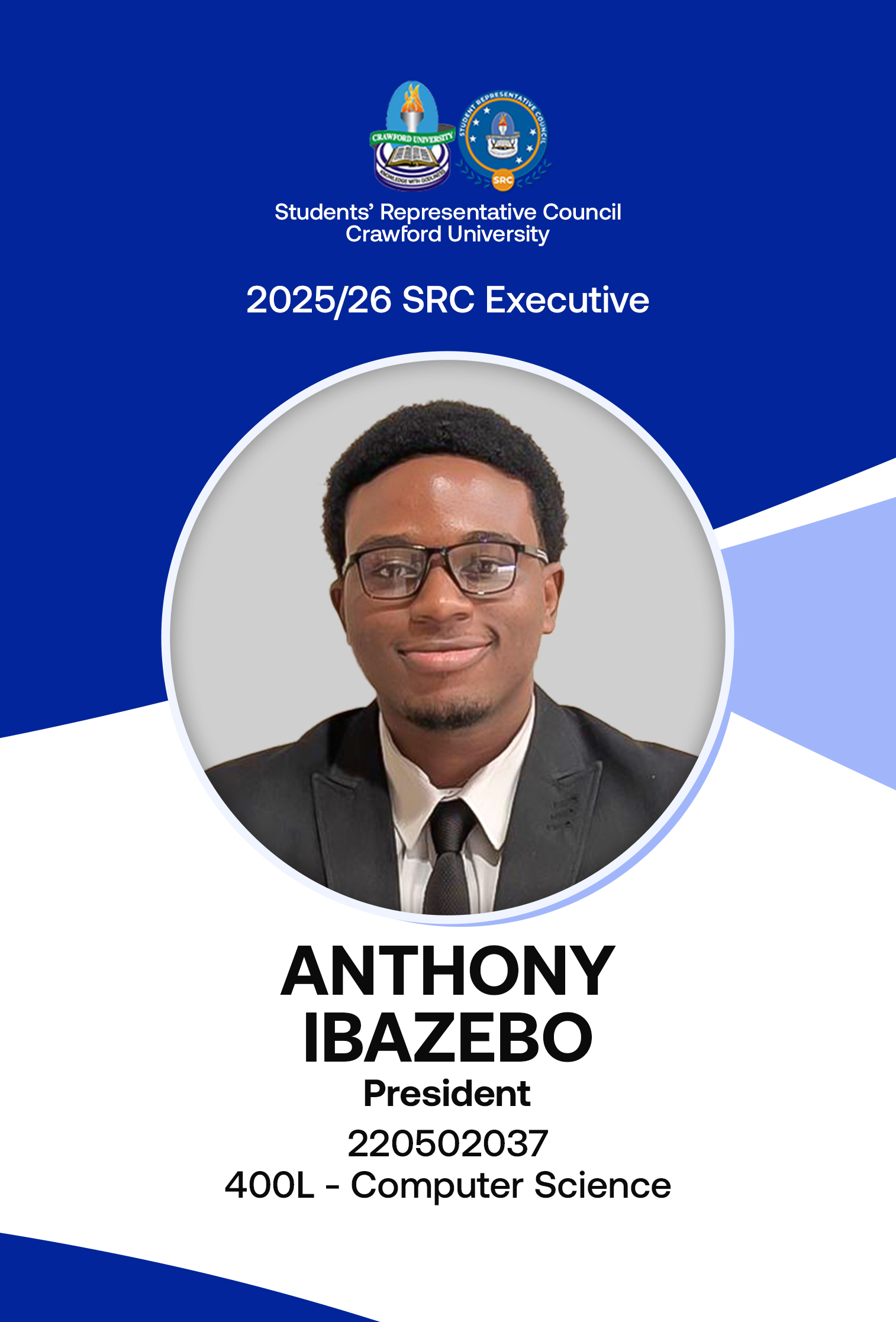 I’m excited to welcome you to Crawford University, a community where we learn, grow, and support one another. As your Student Representative Council President, it’s a privilege to serve and represent a student body filled with creativity, ambition, and purpose.